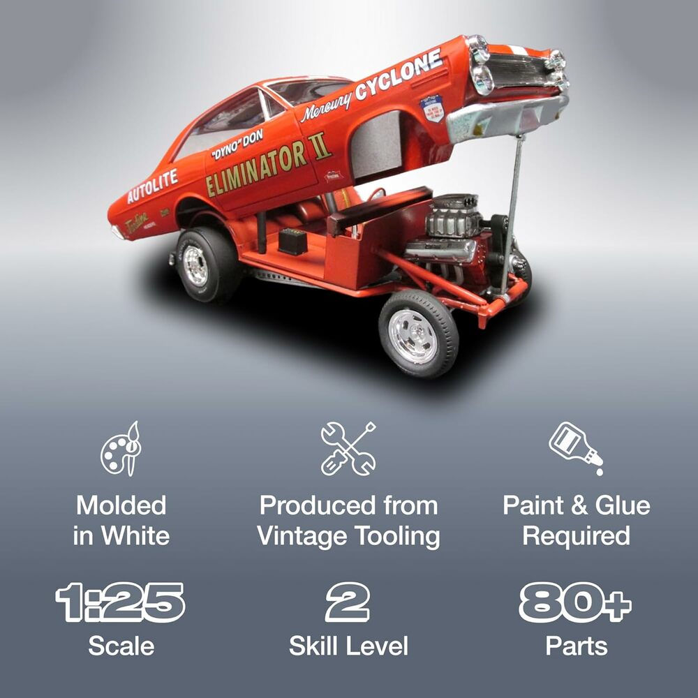 Nothing's as rewarding as assembling a model car from scratch. Give it a go with our 1967 Mercury Cyclone Eliminator II, the same racer driven by Don Nicholson in the '60s. Once built, this 1/25 scale vintage drag racer will look identical to the real thing! It comes molded in white and with the sought after altered wheelbase dragster kit, red-tinted windows, and authentic decals with original artwork.