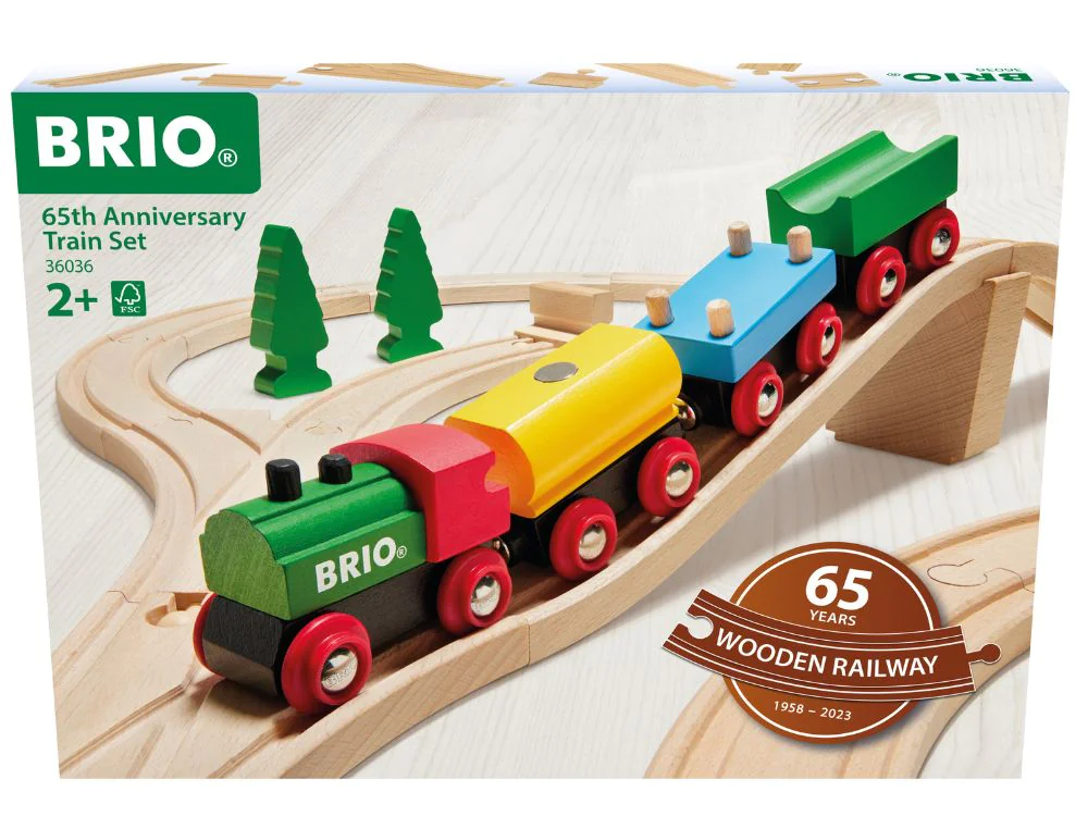 Celebrate classic railway play with the 36036 65th Anniversary Train Set. This all wooden train set takes inspiration from our iconic BRIO railway products first launched in 1958. The 32 piece set is made from FSC-certified European beech wood and includes a classic BRIO train with 3 wooden wagons in bright colours, bridge, switching tracks and wooden trees for scenic decoration.