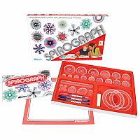 This commemorative edition Spirograph set is a reproduction of the original—just like you remember—featuring throwback packaging and retro graphics! With all the iconic wheels and rings of the original, the precision engineered Spirograph gears work with the three design pens included, as well as with most standard pens, markers and pencils.