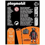 Kakuzu is a tall, muscular man with striking red eyes and green pupils. He is one of the oldest members of Akatsuki, where he mostly takes care of the finances. Kakuzu is very irritable and suspicious. Money means everything to him, so he is always willing to take detours to collect a bounty. The PLAYMOBIL playset shows Kakuzu in a typical black coat with red clouds and suitcase.