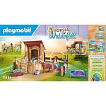 - Set includes a PLAYMOBIL stable with PLAYMOBIL figure, two ponies, a horse box with washing area, fence elements, and numerous extras for horse care.