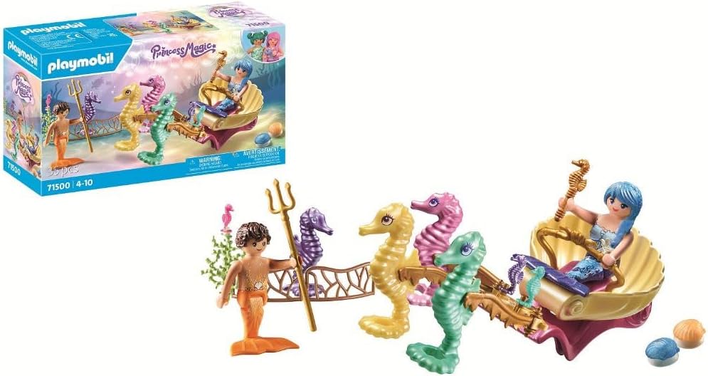 Dive in and play with the fantastic PLAYMOBIL playset, Mermaid with Seahorse Carriage. Alongside seahorses, mermaids explore the ocean in their shimmering underwater carriage. What adventures await them today? The Princess Magic Mermaid World by PLAYMOBIL invites children into a magical underwater realm.
