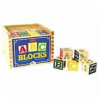 Set of 48-1 1/8" wooden ABC blocks Packaged in a wooden storage box with sliding lid