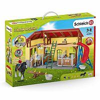 The new colourful horse stable offers lots of fun features and provides endless fun for little ones! With 7 cute animals, 2 horse boxes, farmers Paul and Laura and, of course, lots of accessories, it is easy to reproduce all the daily work on the farm. While the farmer's wife prepares to go for a ride, farmer Paul uses the hoist to transport new feed to the hayloft. It is always easy for him to transport the hay bales to the feed chute thanks to the moving transport rollers that help them fall easily into the wheelbarrow. The feed indicator can be gradually adjusted according to the amount of feed the animals need. Has the farmer discovered the cute mouse sitting in his mouse hole? Children can use the sticker to personalise the horse stable however they wish.