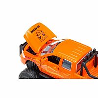 This beloved US custom variant of the Dodge RAM not only has flames on the bodywork, but fire up front too: 395 HP under the bonnet! The front is decorated with the brawny head of a ram, symbolising power and strength. The well-known bull bar, a massive frontal protector, reinforces the particularly robust appearance. A frame positioned on the cargo area supports a lighting unit with four spotlights. The bodywork of this siku model is made of metal, and the bonnet, doors, and rear flap can be opened. Each of its axles is individually sprung, and the wheels can be changed. As a high-chassis custom variant in bright orange with particularly thick and broad balloon tyres and flames printed on both sides, the RAM 1500 creates an impressive appearance often seen on American highways.