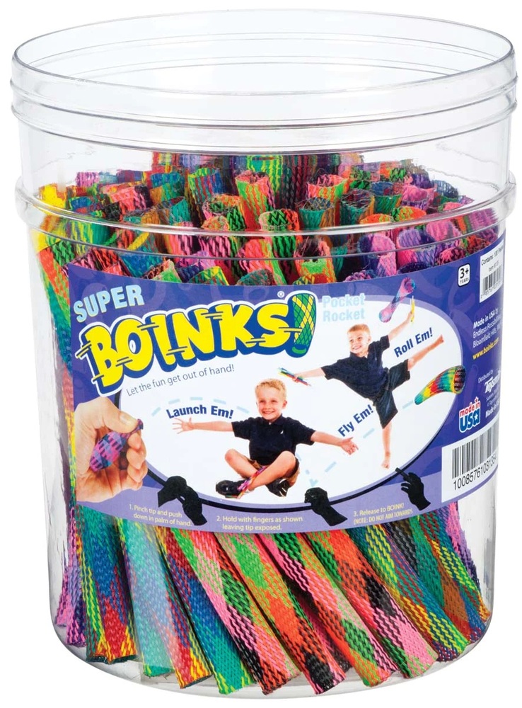 A jumbo-sized version of the popular Boinks Pocket Rocket, Super Boinks Pocket Rocket launch toys are available in an assortment of solid or mixed colors. Each one measures 7 inches long. Wear them, fling them, or pop them in the air. Suitable for indoor or outdoor play. These fidget toys have a woven texture and hand-propelled design. Easy to fit in pockets or purses for instant entertainment anywhere, anytime. No batteries or assembly required.